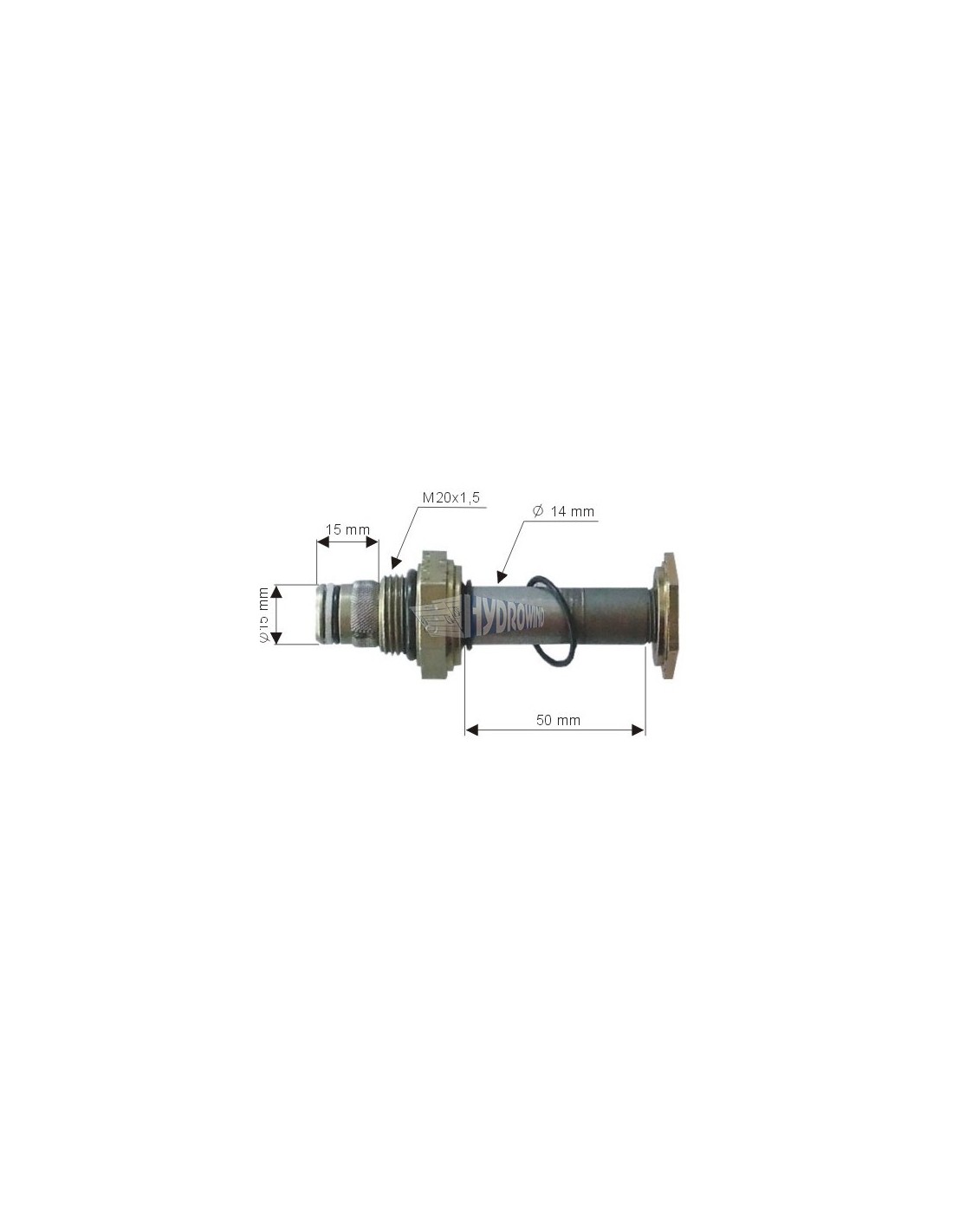 Zawór pojedynczego działania.Średnica noska: 15 mmDługość noska: 15 mmGwint: M20x1,5 mmŚrednica trzpienia: 14 mmDługość trzpienia: 50 mm